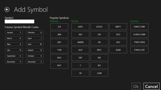 When the app is launched for the first time the interface of the app will be completely empty as seen above to get started with the app simply right click anywhere in the app and you will have an option menu in front of you from that option menu click on the ‘add’ button and you will have the window in front of you as shown below. Here you have a search box located on the left side of the app window. By using this you can search for stock, indexes, and futures and add them to this stock tracker for Windows 8. Also on the right side of the app window you are provided with some of the most popular indexes, stocks, and futures. After you are done adding, click on the ‘ok’ button and you will be taken to the main interface as shown in the first screenshot of the post.