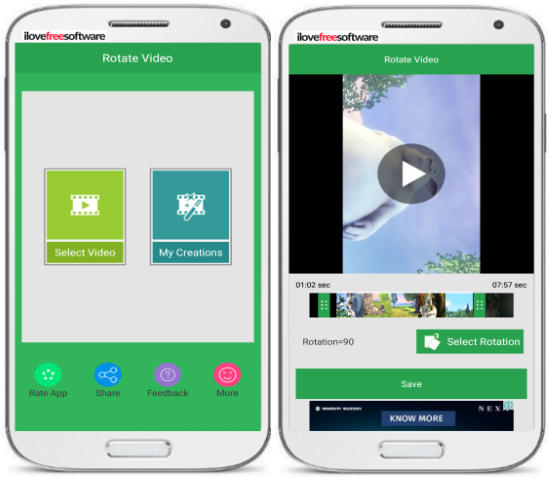 Video Editor is another free Android app to rotate videos. You can rotate a video by 90, 180, and 270 degrees and save the rotated video on your phone. It also doesn’t add any watermark on the rotated video. In addition to video rotation, you can also create slow motion videos, flip videos, extract audio from videos, and many other things. After installing it, simply tap on the Rotate Video option and then select a video. After that, you will see its editing interface on which you can select the start and end video frames and the rotation angle by which you want your video to be rotated. At last, click on the Save button to store the rotated video on your device.