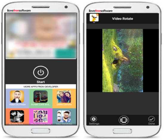 Video Rotate is a free Android app specifically designed to rotate videos. Just as in the previous app on my list, you can rotate a video by 90, 180, 270, or 360 degrees and save on your phone or share with your friends. One of the unique features of this app is that you can select a video duration to rotate it. By default, the app will process the first 15 seconds of the selected/imported video to rotate it. You can change this video duration to 30, 45 seconds, 1, 2, 3 minutes, and original to rotate the complete video. You can select a video from the Gallery to import. It then opens the video in its editing interface, as shown in the screenshot above. Now, all you have to do is tap on the Rotate button and see the rotated video thumbnail. To change the video duration to process and rotate, tap on the Settings button and then select the video duration. At last, tap on the Done button to rotate the video and see its preview. You can play the preview to see if the video has been rotated as per specified parameters or not. If not, then you can go back to the previous step and specify video rotation parameters again. If the video has been correctly rotated, then tap on the Done button to either save it to your device or share it on Facebook.