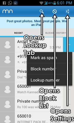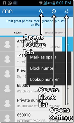 Mr. Number is a good call/text Blocker app for Android devices, which does the task of blocking calls and texts fairly accurately, and also offers a bonus Lookup feature within the app itself.