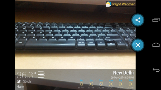 One of my favorite feature is the ability to take a picture with the weather details in it. To access this, simply tap on the camera button as pointed below. You can share this image directly from the app as seen here. Unfortunately it is not directly saved to the phone but you can always email yourself the image. This feature would come quite handy if you have gone on some scenic place and want to capture the weather details also in the picture (I am planning to go on a vacation shortly, and will definitely use this feature of the app).