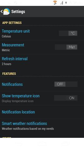 Bright Weather for Android provides you the ability to switch units, change refresh intervals, show a persistent notification, show smart weather notification, and more in the setting section.