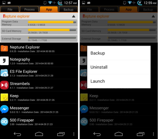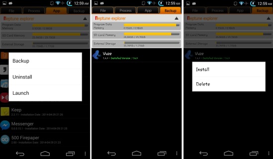 Tap on the tab labeled app to open up app manager. Here Neptune File Explorer for Android provides you the ability to view and manage all the app which are installed on your device. Just tap on an app and you will have the option to uninstall, backup, or launch it. In this way you can manage apps as well from this file manager for Android.