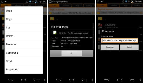 When you long press on files, then you are provided with the options as seen below. When you tap on the details option, the app shows all the details such as location, size, date, and attributes as seen here of a file. Also you can see that files and folders can be compressed by using Neptune File Explorer for Android.