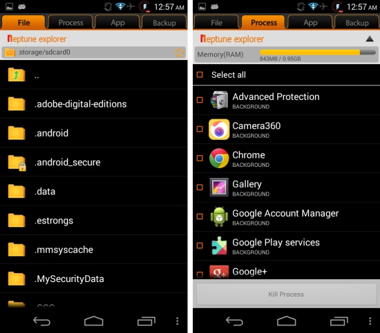 Neptune file explorer for Android is a free lightweight file manager for Android devices. This free file explorer lets you manage folder and files also Neptune file explorer comes with other interesting features such as process manager, application manager, backup manager, ability to create and extract zip files etc. Neptune file explorer for Android features a very easy, intuitive, and useful interface. This app delivers a user friendly and easy to use interface for managing the file and folders on your device.