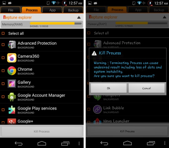 This app also provides you the ability to view and manage the processes running on the device. Just tap on the process tab to view all the process. Here you will have a bar showing the total RAM use and below that all the apps which are running are shown. Just tap on apps to select them after which you can press the kill process button to stop the app and free up some memory.