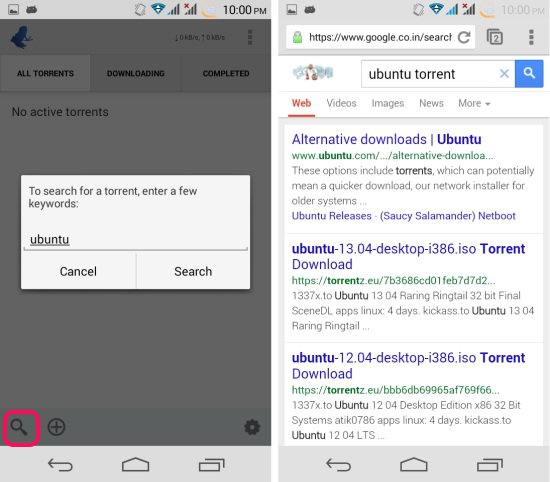 Also, you can tap on the search button and then search for the torrent from within the app. The results will be shown as a web page. From here you can download and add torrent to the app.