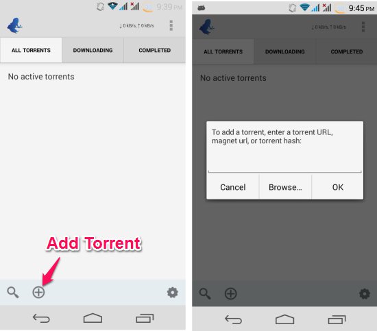 You can get Vuze Torrent Downloader for Android from the link or QR code given at the end of this review. On launching the app, you will have the interface as seen below. To add a torrent, simply press the ‘add’ button, as seen below. The app will present you with four ways to add a torrent file: you can add torrent URL, magnet link, the torrent hash, or you can browse your device and add a torrent file.
