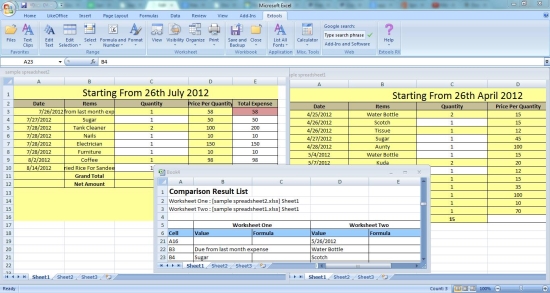 Extools is a free Add-In for Microsoft Excel that offers a bunch of powerful tools and utilities including file comparison function. It’s a useful tool built with powerful Excel VBA macros, which is free both for personal as well as commercial use.