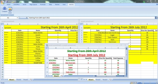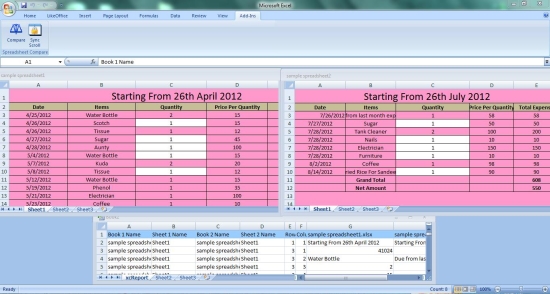 xc Excel Compare is another free Excel Add-In that allows comparison of spreadsheets via values or formulas. It’s a simple to use tool that highlight all differences between two Excel files and generates a comparison report for that. xc Excel Compare works with Microsoft Excel 2007 and 2010 only.