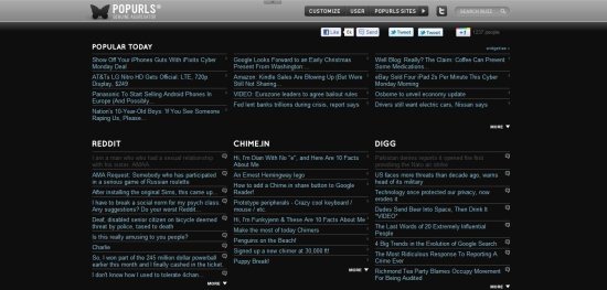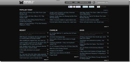 Popurls is one of it’s kind news aggregator which has a user-friendly interface full of news content. This news aggregator consist of a special feature, whenever you place mouse cursor on any of the news it shows 2 options which are “Share” or “Clip”. For sharing you need to create an account with Popurls. Creating an account results in permanently storing custom settings of a user across all computers and moreover offers you personalized features, all these for free. And if you click on Clip option then that post gets stored to the clipbook. Clipbook can be viewed from the “User” tab. This site also includes a “Customize” tab which allows you to customize layout, design, switch view, etc.
