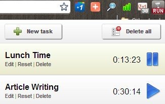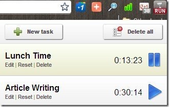 Chrome Time Track works differently than the two we discussed above. Chrome Time Track works by tracking the tasks which you perform on your computer. You just have to launch the extension, type the name of the task, and you are done with. Now, you will see a play/pause button on the right side of the task. Click on the play button when you start the task and the extension will start recording the time. You can add multiple task and run the timer altogether on your Chrome browser. This is not automated, and it cannot detect what task you are doing. You have to manually specify the task you are working on, and application will basically record time for you.