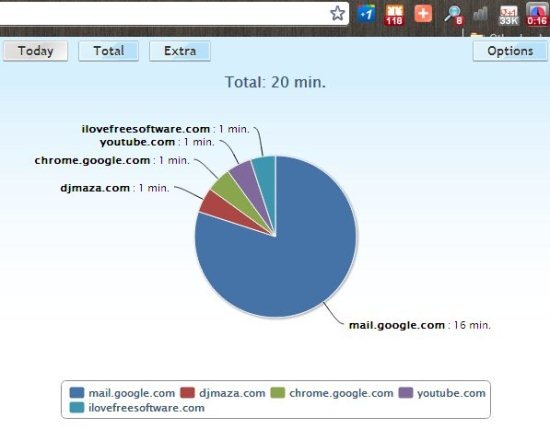 Time Counter is a free time tracking Chrome extension to track time spent on each website on Google Chrome browser. This extension is a quite smart time tracking extension which shows the data in the form of pie chart which gives a clear picture of where you spend your maximum time. This helps you to prepare a detailed report of your time spending on internet. All the websites in the pie chart are identified by different colors. You can also check the report of today and total of all the days. You can also check settings by clicking on options button in the extension. Also, Time Counter extension is a well known extension in Web Store to track time on Google Chrome browser.
