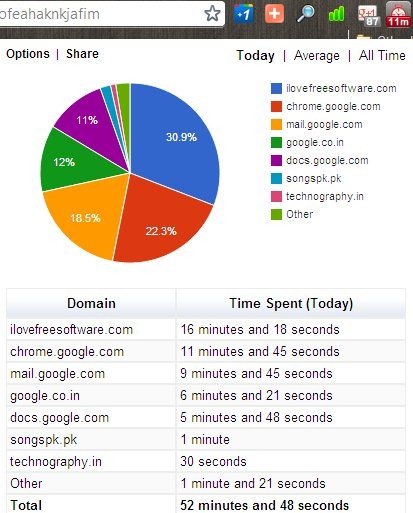 Web Timer is a free time tracker Chrome extension to track time spent on each website accessed in every tab of Google Chrome browser. This Web Timer extension tracks the exact time of the web pages which you access on your Chrome browser. The extension even shows you the stats in the form of pie chart. Web Timer calculates the percentage according to the time spent on each website. After calculating the percentage use, the extension prepares the pie chart according to the percentage calculated. Web Timer also shows the percentage usage for different websites in different colors. This makes it easy for you to identify which are the websites on which you mostly spend the time. You can also share the report or stats.