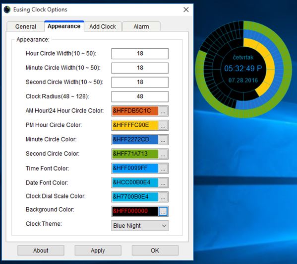 Instead of clock hands, you have three circular progress bars. One for seconds, one for minutes and one for hours. These circular progress bars are located around a central circle where you can see a digital clock with the date. Check out the clock widget itself on the image above. Clock appearance is completely customizable, from size, colors, overall theme, to technical stuff like time formating (12/24H), daylight savings, etc. Multiple widgets can run at the same time (if you need to track multiple time zones). Other features include an alarm and that’s about it. Application is portable, so you won’t need to install it in order to test it out.
