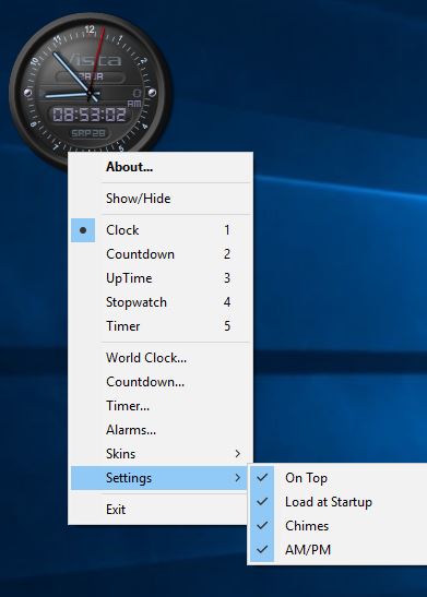 With Vista Clock I’ve discovered that there are actually a port of the original Vista desktop clock widget software, which works just fine on Windows 10. Right clicking shows the wide range of functionalities offered by Vista Clock.