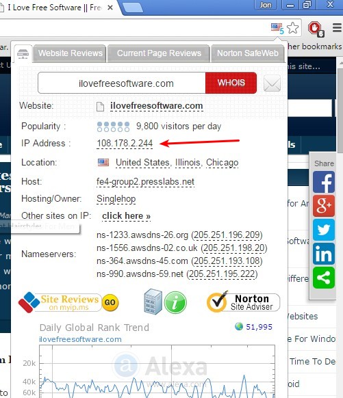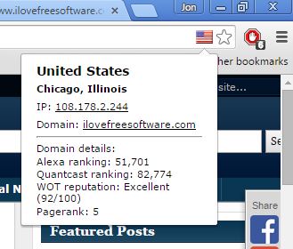 It will add a flag of the country where every visited website is hosted. Flag icon is added to the address bar. Left click on the flag reveals additional info in a pop up. It offers the IP address of the domain, approximate location and even a short overview of search engine ranking details. IP Domain Country Flag is basically a great mix of the two domain to IP converter extensions that I covered up until now.
