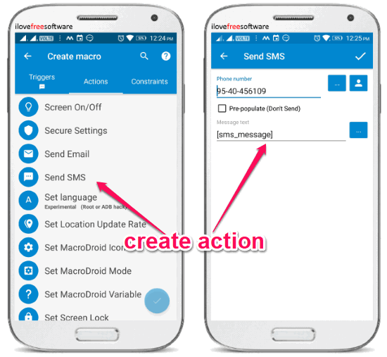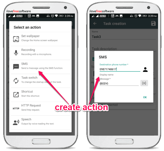 Step 2: Once you do that, tap on the “Action” option and the select “SMS” as the task action. When you do that, a popup dialog will appear on which you would need to enter the destination phone number and construct the message body.