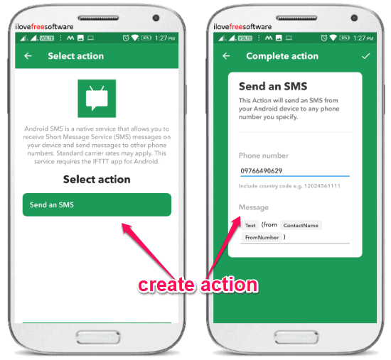 Step 2: After that, you would need to select the action app as “Android SMS” and then choose “Send an SMS” as the applet action. When you do that, it will ask you to enter the phone number on which you would like to forward the SMS. Apart from that, it will also allow you to set the message content by adding different ingredients.
