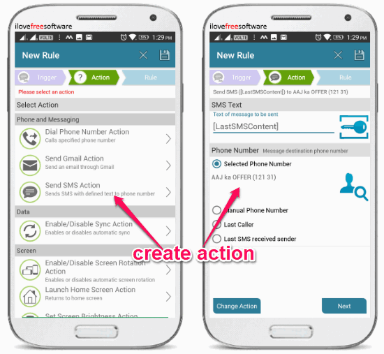 Step 2: After that, proceed to the next step and choose “Send SMS Action” as the rule action. Then it will ask you to enter the phone number to which the SMS will be forwarded and also the message content. You can select any contact from your phonebook or enter manually.