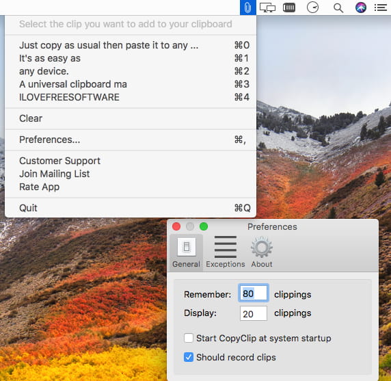 Just get it from the MAC store and then simply install it. After that, open it, and it will start recording the entries. You can see the clipboard entries on its interface and you can copy them again to the clipboard. Just select any entry from the list and it will be immediately copied to the clipboard. Additionally, you can open the preferences section of this app and then manage the number of entries to be shown in the menu bar interface. Also, you can add some applications in the “Exceptions” list and this app will not record clipboard data while apps are running.