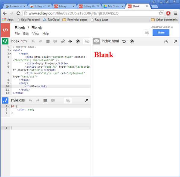 Editey is a full featured web development editor for Chrome, where HTML and CSS editing is available side by side (2 tabs in the sidebar on the left). Website preview is possible in real time (preview tab on the right). After launching the app you’ll be asked to connect to your Google account and create a project folder on your Google Drive where files are going to be saved. Simplistic WYSIWYG editor is available, see image above.