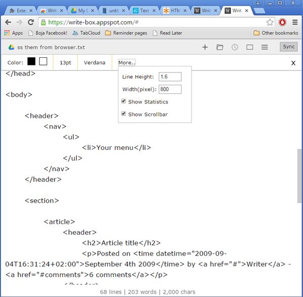 Writebox is a Google Drive text editor which focuses more on writers, instead of programmers. What this means is that it doesn’t have syntax highlighting, find and replace, jump to line or anything like that.