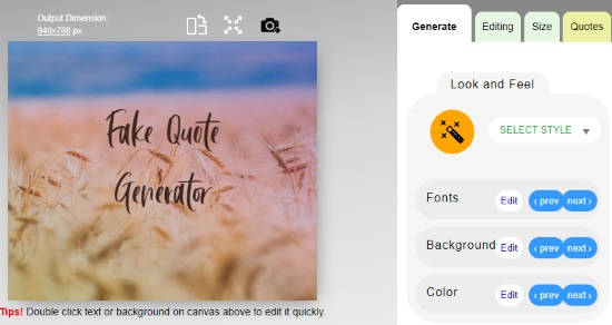 The websites basically provide you free templates which you can edit with your own creativity. You just need to pick a relevant template or if there is only one template, use that to make a fake quote. To create fake quote, you can type the quote which you want to display in the image. Also, you can leave the signature below and add images for the background. The text style, font size, and color can also be changed.