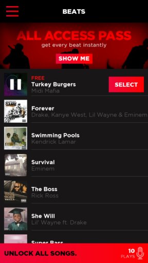 AutoRap by Smule is a very easy to use rap song generator which creates unique rap songs with the help of your voice and your lyrics of course. App comes with a list of beats, some of the premium ones can be seen on the image above.
