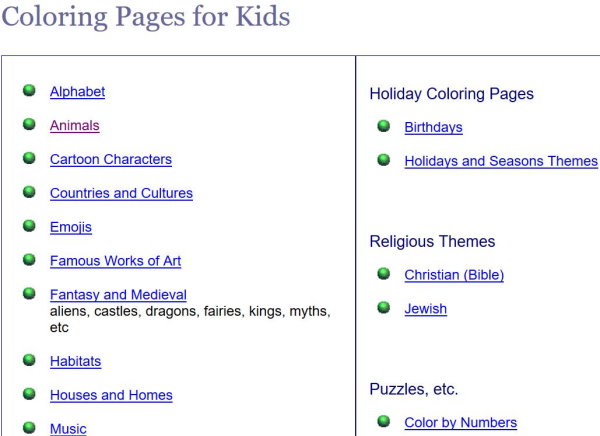 Mom Junction has lovely coloring pages for kids. The coloring pages are divided into various categories like animals, Bible, Cartoons, countries, Disney, educational, farm, flowers, holidays, music, pattern, snacks, sports, etc. Select a category and all the coloring pages in that category will be listed in tiled format with a thumbnail visible for each page.
