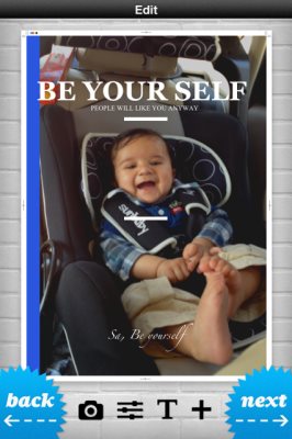 When you click the create new button, you will be taken to the “select template” page. Here you will be required to select the poster template which you would like to use for your poster. Once you zero down on a template, click it and it will open fullscreen asking you to select a photo. You get two option to fetch the photo from, you can either get it from your photo album or take a new picture using your phone’s camera. I went for the photo albums option, so I was directed to my photo album. After choosing a photo, you get options to customize it. At the bottom of the screen you would see options to do that. See the screenshot given below.