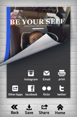 You can adjust the contrast, brightness, saturation, change background color, add text, resize the added text, change the color of the added text, add textbox. After adding the things you wanted to click next at the bottom right of the screen. Now you get to select which filter you want to apply like pattern, dust, grid, stripe, etc. Each of these filters add an amazing effect to your poster. After selecting the filter, you are taken to the next screen where you get options for saving or sharing the poster you just created. Save option will save the poster to your photo album and share let’s you share the poster on sites like Instagram, Facebook, Flickr, Twitter, Email it or just simply print it. See the sharing screen in the screenshot below.