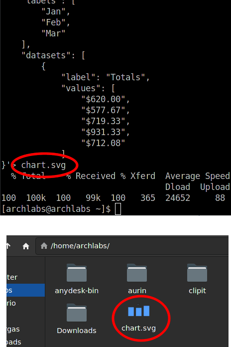 In my case, I will just make the API call from the Terminal using cURL. So, you just copy the cURL command then paste it in the terminal. For simple bar chart generation, you can use the following syntax. There are 3 routes for generation; for SVG, for PNG, and for HTML. Now, you get the response. I have saved the output generated by the above API call in an SVG file.