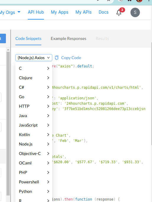 Next, you start making the API request. Just select any programming language from the list and it will show you the corresponding API syntax. You can see this screenshot below.
