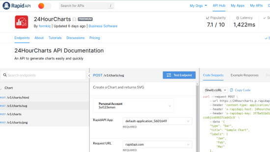24HourCharts is hosted on RapidAPI. You just create a free account and then subscribe to this API here. Or, if you already have RapidAPI account, then you can just log in and then simply learn about the routes and docs that it has.