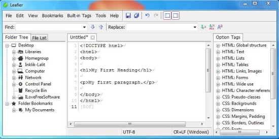 Leafier is a complete HTML editor, or I should say a full-fledged program that provides all necessary features a good HTML editor should have. Apart from providing tag insertion functionality, it also offers syntax highlighting, multi-tabbed window interface, and character encoding. Moreover you can export files into CSS format.