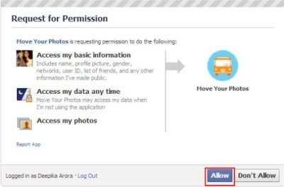 - Click on “Allow” button to allow “Move Your Photos” have access to your Facebook Account. You will be prompted to Login quickly if your are not.