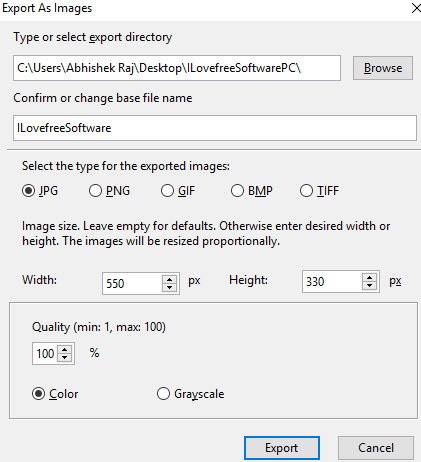 It will then pop-up a dialog box in which you have to specify the parameters for the extracted slides images. Specify a path where you want to export the slides as images and specify a base name for the image files naming convention. Select an image format, specify its dimensions, and select image quality. At last, click on the Export button and then all the LibreOffice Impress slides will be automatically extracted or exported to the specified directory and parameters.