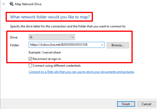 Step 4: Map Network Drive window will open. Now you can select a drive letter for OneDrive. In the folder path, you need to enter “https://d.docs.live.net/YourCIDNumber“.