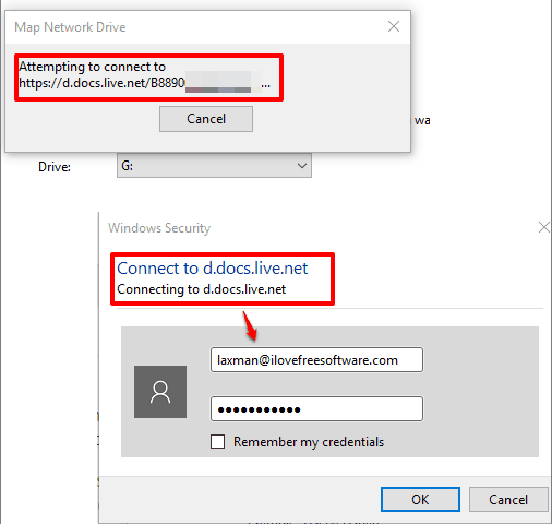 Step 5: Click Finish button and it will start the mapping process. During this process, Windows Security window will open. Using that window, you can enter your OneDrive credentials.