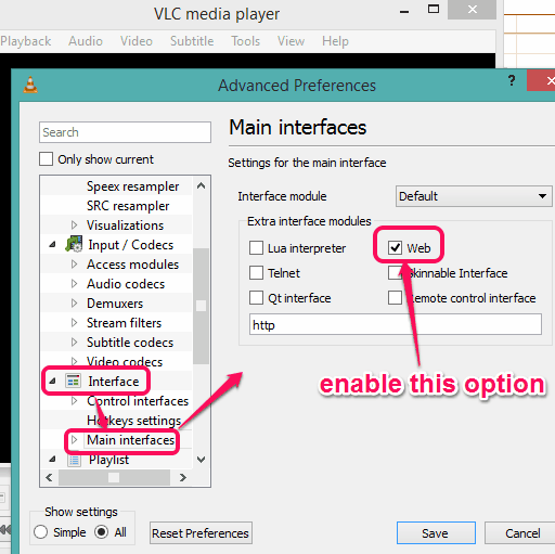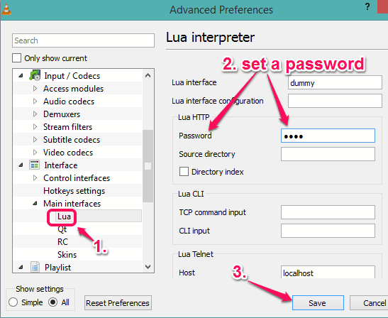 Step 5: Go back to Main interfaces option and explore it. You will find Lua option. Select that option. After this, you need to set a password (in Lua HTTP). It is essential so that you can remotely access VLC playback and control it.