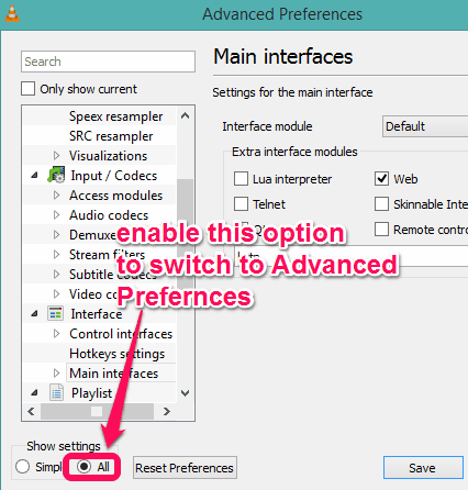 Step 3: In Advanced Preferences window, find Interface option, like you can see in screenshot below. Under that option, you will find Main interfaces option. Click it.