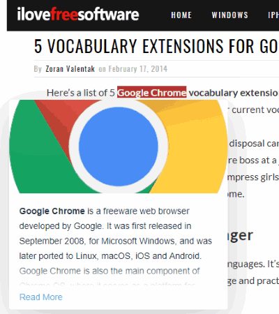 This tutorial covers how to see Wikipedia summary for selected word on any webpage. When you select some word and if Wikipedia article exists for such word, then a pop-up is displayed. It shows Wikipedia article summary for that particular word. A “Read more” option is also visible on that pop-up. You can use that option to open the Wikipedia article for the same word in a new tab. So, instead of copying that text and opening a new tab to search Wikipedia article for a word or using right-click menu, you can get Wikipedia summary within the active webpage.