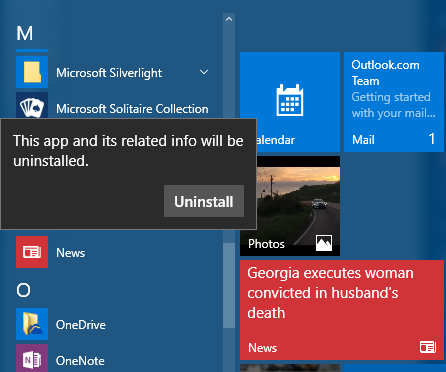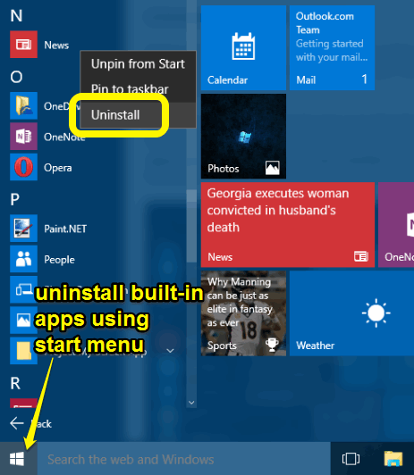 Uninstall Windows 10 Built-In Apps using Start Menu: