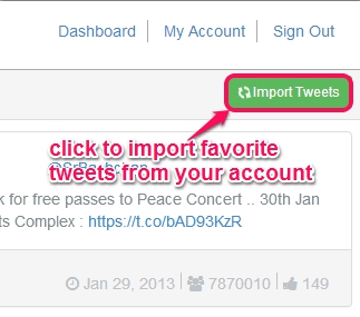 On its homepage, use Twitter sign in button and login to your Twitter account (if not logged in already). Give Tweetbits authorization to your Twitter account. After this, you can use this service to import tweets, create categories, and move those tweets to categories. On the dashboard of your account, click on Import Tweets button, and it will automatically fetch favorite tweets (first 50 tweets only) from your account.