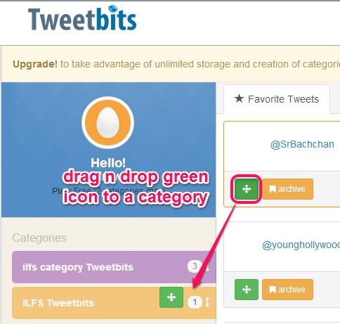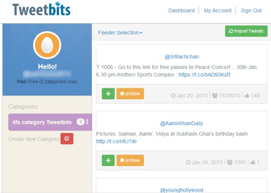 Tweetbits is a free online service that helps you to add favorite tweets into categories and lets you easily track those tweets. By creating a free account with Tweetbits, you will be able to import tweets that you have marked as favorites on your Twitter account. Later on, you can create a category and all imported favorite tweets can be added into that category just by dragging and dropping. You can also move favorite tweets to archive which you might be needing for later use.