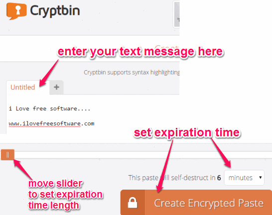 Go to the homepage of this website using the link I have placed at the end of this review. On its homepage, you will find Untitled tab. Use this tab to write required text or paste the text content. After this, scroll down to set time limit to destruct the message automatically, if required.