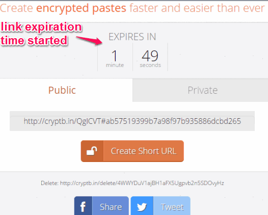 You can set time limit by moving the slider and by using the drop down option. Destruction time can be set in minutes, hours, or in days. After setting the preferences, click on Create Encrypted Paste button. After this, it will encrypt your message and start the expiration time for your message.