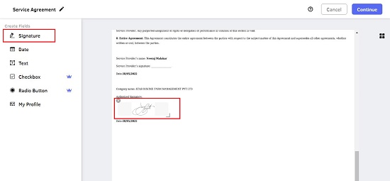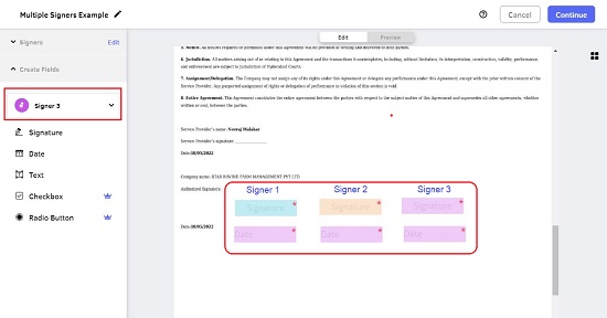 11. In the next screen, click on ‘Signature’ and specify the location in the document where this signer should be inserting his / her signature. Repeat the process for every signer that you have specified above. You can also add a date or text field for each individual signer if required and click on ‘Continue’