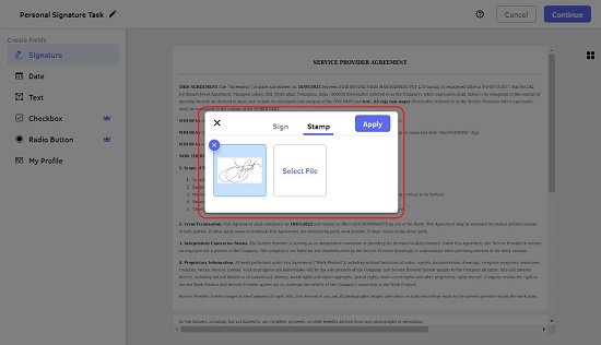 - The signers can personalize and add their signatures to the assigned fields using a hand drawn signature or stamp (image file) and complete the process